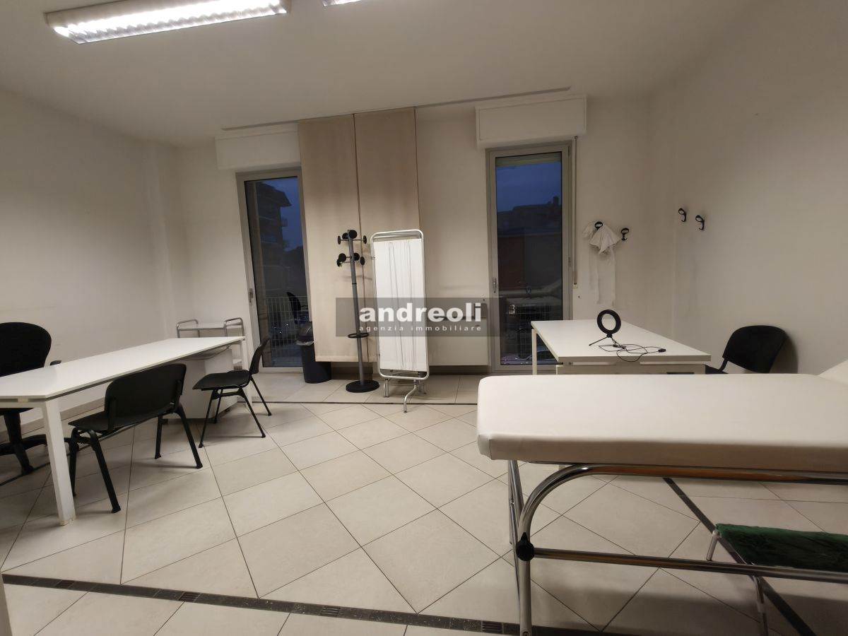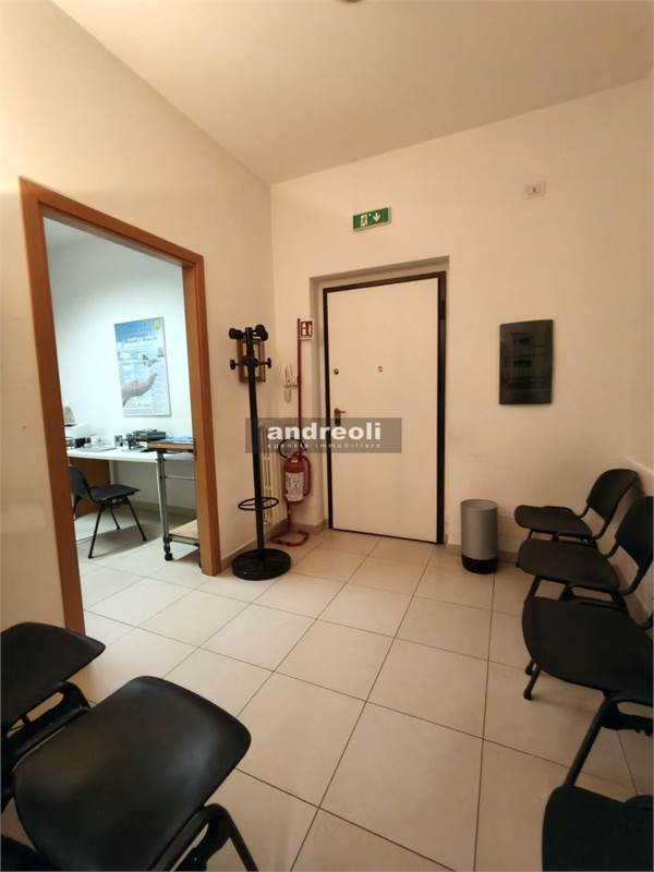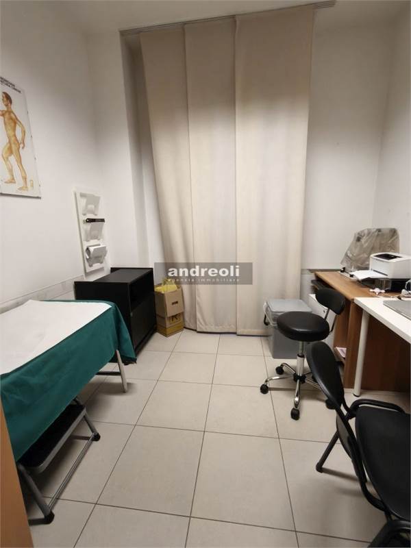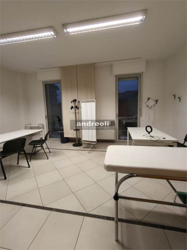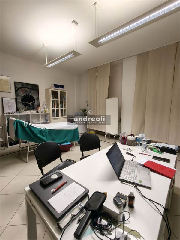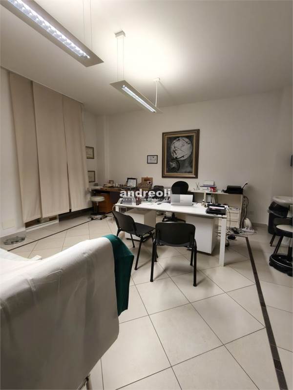 L'immobile è collocato al primo dei tre piani di un edificio servito da ascensore e ha una superficie complessiva di 100 mq. La dislocazione interna dell'ufficio è la seguente: l'ingresso si apre su una sala d'attesa (attualmente è adibito a studio medico), seguita da tre ampie stanze lavoro e da un bagno. Ben rifinito, il locale presenta anche ottimi dettagli interni, tra cui infissi con doppi vetri e aria condizionata.