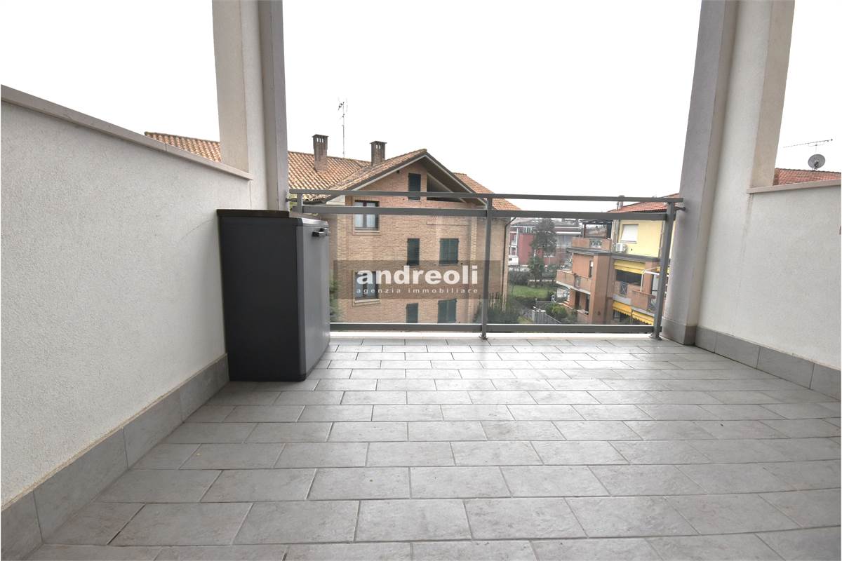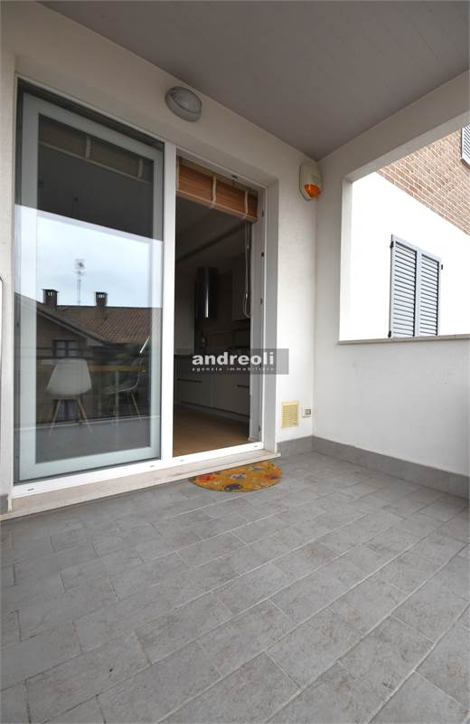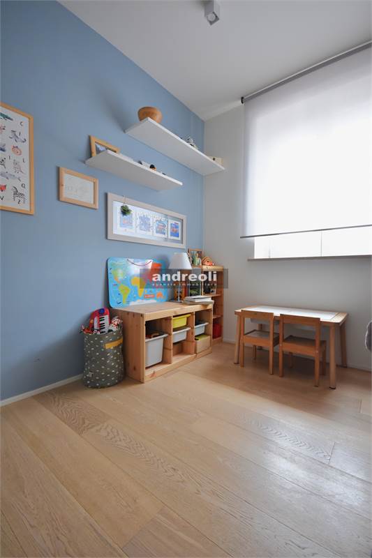 L'ingresso si apre su un'incantevole zona living con cucina a vista, servita da un grande finestrone con ante scorrevoli che permette l'accesso ad un balcone di 6 mq (con lunghezza di 2,7 metri e profondità di 2,3 metri). Proseguendo all'interno dell'appartamento troviamo uno studio, la camera padronale, una cameretta e un bellissimo bagno dotato di doccia e sanitari sospesi.